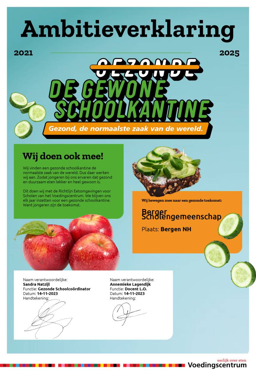 De BSG heeft de ambitieverklaring 'Gezonde School kantine' ondertekend. Hiermee laten we zien dat we gezonde voeding belangrijk vinden. Onze kantine voldoet aan de Richtlijn Eetomgevingen voor Scholen van het Voedingscentrum. Ieder jaar brengen wij het aanbod en de uitstraling van de kantine in kaart met de Kantinescan en rapporteren we de uitkomsten aan de directie. In de kantine kunnen leerlingen kiezen uit een gevarieerd aanbod eten en drinken waarbij de gezonde keuzes een prominente plek in de uitstalling hebben.